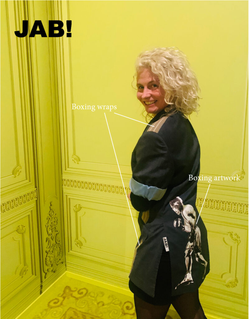 De ‘Jab’ is een stoot die boksers helpt om positie te bepalen. Bestaande kleding wordt ‘geJabbed’ met of gemaakt van boksitems; een jurk en tas van een oude bokszak, een pantalon met de band van een boksbroek, een colbert up-cycled met boksbandages en een hoodie van satijn zoals van een bokser voor aanvang van een gevecht. Het is geen streetwear òf sportkleding, het is niet casual òf chique, het is hybride. Uniek en duurzaam, gesigneerd met een boks-artworkprint van Vera Nederlof.